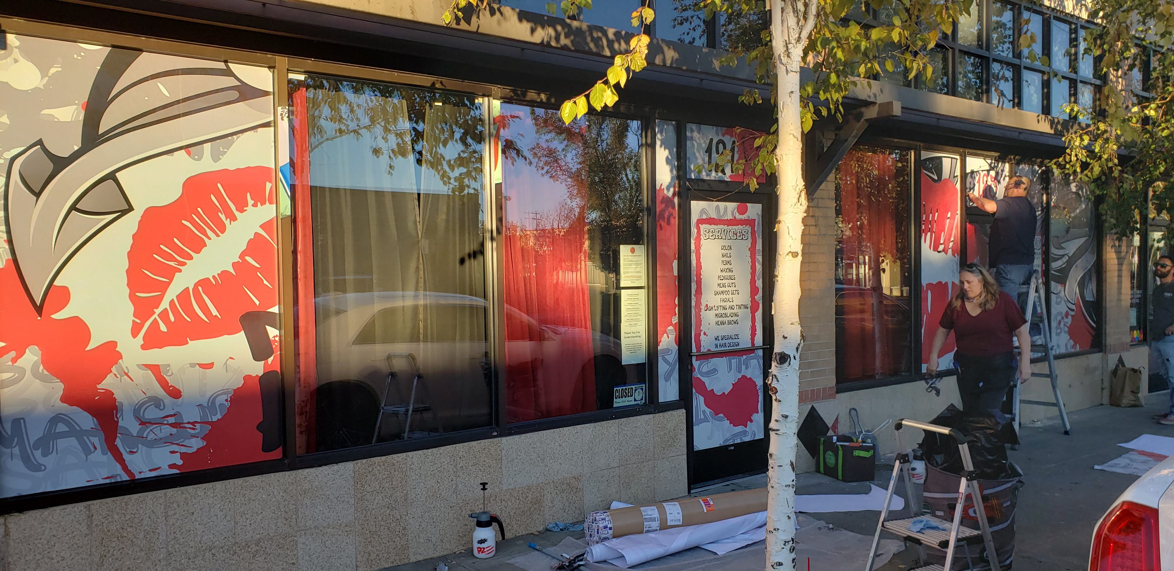 Design and installation of window graphics at a salon in Klamath Falls, OR